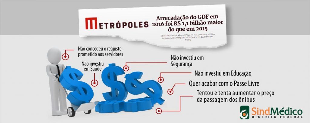 O reajuste dos servidores não foi concedido ano passado, como prometido, porque, segundo o GDF, não havia recursos suficientes em caixa. Na época, a equipe do governo Rollemberg chegou a convocar coletivas de imprensa para explicar a situação. Porém, contrariando o discurso do governador Rodrigo Rollemberg, o portal Metrópoles traz hoje a informação de que a receita total de impostos em 2016 no DF foi R$ 1,17 bilhão maior do que em 2015.
